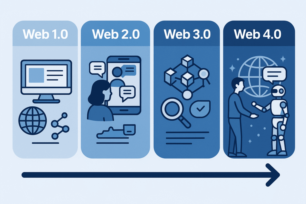 The journey from Web 1.0 to Web 4.0 reflects a shift from static information to intelligent, autonomous ecosystems.